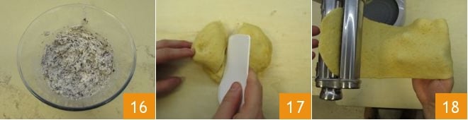 Mettez de côté la garniture 16 et reprenez la pâte des cassatelles: divisez-la en deux 17 puis étalez-la avec la machine à pâtes 18 jusqu'au numéro 7, obtenant ainsi une épaisseur d'environ 1 mm.