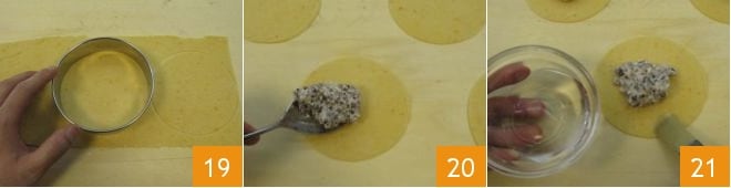 Une fois la pâte étalée, divisez en deux le rectangle et découpez des disques avec un emporte-pièce de 11,5 cm de diamètre 19. Déposez une cuillère à café de garniture au centre des disques 20 mouillez les bords avec un peu d'eau 21, afin que la garniture, en repliant la pâte, soit parfaitement scellée.