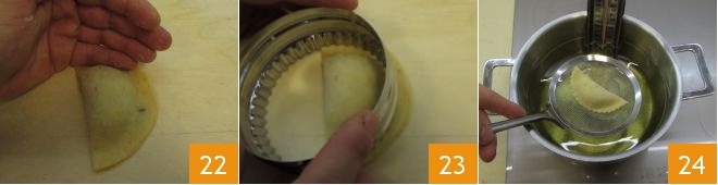 Repliez les cassatelles en formant un croissant et scellez bien les bords en pressant avec le dos de la main tout autour 22. Découpez le bord du demi-cercle, en ajustant la partie avec la garniture, avec un emporte-pièce dentelé pour créer un bord décoré 23. Continuez ainsi avec le reste de la pâte: avec les doses indiquées vous obtiendrez environ 20 pièces. Une fois prêtes, vous pouvez frire vos cassatelles de Carnaval: faites chauffer l'huile de graines dans une casserole à bords hauts et lorsqu'elle atteint la température de 170° (à mesurer avec un thermomètre de cuisine), plongez délicatement les cassatelles, peu à la fois 24 afin de ne pas trop baisser la température de l'huile.