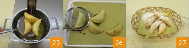 Faites cuire les cassatelles environ 3 minutes; une fois cuites 25, égouttez-les sur du papier absorbant 26. Une fois tiédies, saupoudrez les cassatelles de Carnaval de sucre glace à votre goût et servez-les immédiatement 27!