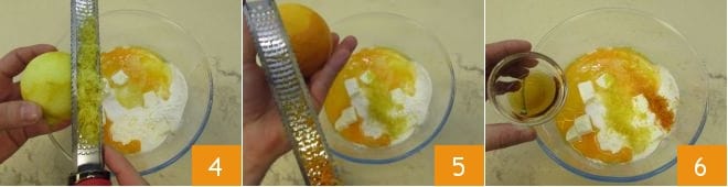 aromatisez avec le zeste de citron 4 et celui d'orange 5 et pour finir, parfumez la pâte avec le marsala 6.
