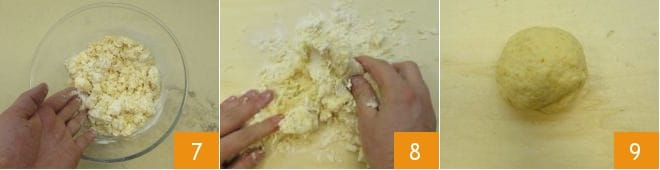 Pétrissez à la main les ingrédients 7 et une fois les liquides absorbés, transférez la pâte sur une planche à pâtisserie 8, travaillez-la jusqu'à ce qu'elle soit lisse et compacte 9.
