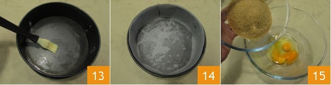 Entre-temps, consacrez-vous à la préparation du gâteau. Graissez le moule avec un filet d'huile 13 et tapissez-le de papier sulfurisé 14. Dans un grand bol, versez les œufs avec le sucre 15.