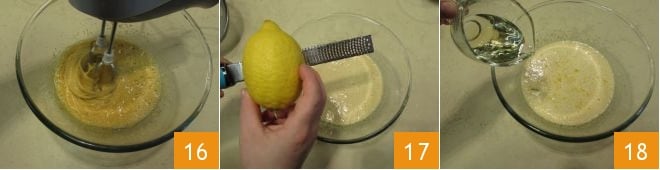 Travaillez-les rapidement avec un batteur 16 jusqu'à obtenir un mélange mousseux. Ajoutez le zeste de citron râpé 17 et l'huile de graines 18.
