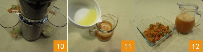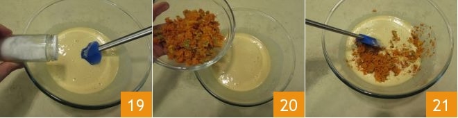 Mélangez avec une spatule et ajoutez le sel 19. Ajoutez également 100 g de restes du jus centrifugé 20 et en continuant à mélanger avec une spatule, incorporez-les au mélange 21.