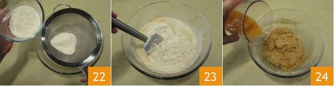Tamisez les farines 22, incorporez-les à la pâte 23 et ajoutez également les 80 g de jus centrifugé 24 en continuant à mélanger.