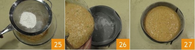 Incorporez au mélange également la fécule et la levure, toujours tamisées 25. Mélangez bien le tout, toujours en remuant avec une spatule, et versez-le dans le moule (26-27).