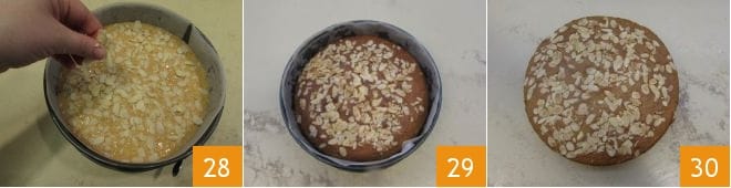 Complétez en disposant les amandes effilées en surface 28. Enfournez dans un four statique préchauffé à 180° pour 35-40 minutes 29 (si vous utilisez le four ventilé, 160° pendant environ 30 minutes). Pour vous assurer que le gâteau est cuit, faites toujours le test du cure-dent. Laissez refroidir 30, puis démoulez le gâteau et servez votre jus centrifugé accompagné du gâteau avec les épluchures !