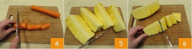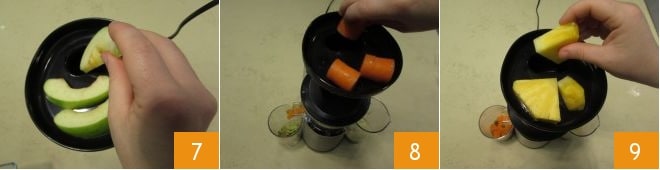 À ce stade, insérez dans la centrifugeuse les fruits : les morceaux de pomme 7 et de carottes 8, tous deux avec la peau pour ne pas les priver de leurs propriétés nutritives, et enfin ceux d'ananas 9.