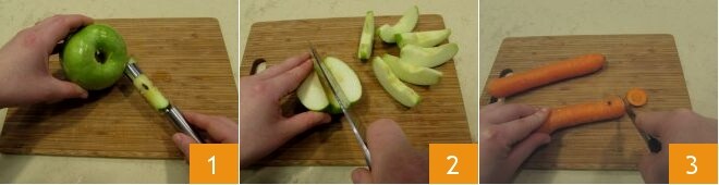 Pour préparer le jus centrifugé et le gâteau avec les épluchures, commencez par préparer le jus, en commençant par les fruits. Lavez bien les pommes (vous pouvez utiliser soit les Granny Smith soit les Golden) et retirez le trognon avec l'outil approprié 1, puis coupez-les en quartiers, sans enlever la peau 2. Lavez également les carottes et équeutez-les 3.