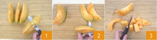Pour préparer les chupitos de melon avec sachets de feta, commencez par nettoyer le melon. Coupez le melon en quartiers et retirez les graines et les filaments intérieurs 1. Passez ensuite le couteau entre la peau et la chair pour éplucher chaque tranche 2 et enfin découpez la chair en gros morceaux 3.