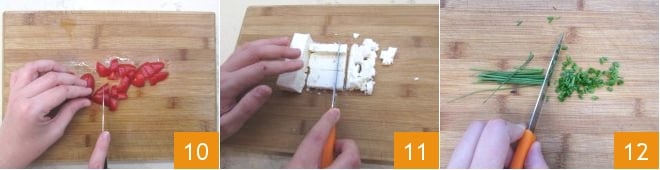 Enfin, coupez les lanières pour obtenir des dés 10. Réservez-les et passez à la feta. Coupez-la d’abord en lanières puis en dés 11 de taille similaire à ceux des tomates cerises. Hachez ensuite finement la ciboulette 12.