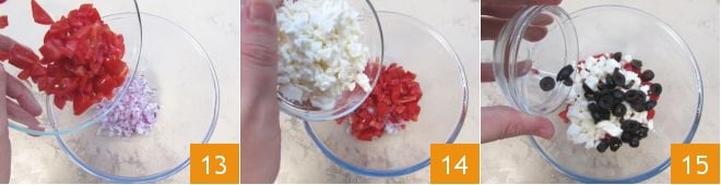 Dans un grand bol, versez l’oignon, les tomates cerises 13, la feta 14, les olives en rondelles 15