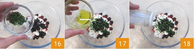 Et la ciboulette 16. Assaisonnez avec l’huile 17 et une pincée de sel 18 : il en faudra peu, car la feta est déjà très salée.
