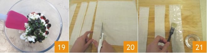 Mélangez bien pour amalgamer les ingrédients 19 et mettez de côté. Disposez ensuite deux feuilles de pâte phyllo de 48x34 cm l’une sur l’autre, et posez-les sur le plan de travail, la partie la plus longue à la base. Avec une paire de ciseaux, coupez 8 bandes de 6 cm de large 20. Badigeonnez les bandes avec un peu d’eau pour les réhydrater 21.
