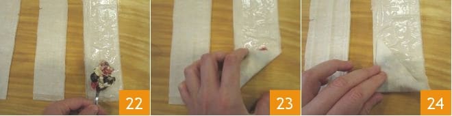 Déposez une petite cuillerée de garniture à la base de la bande de pâte phyllo 22, et repliez un bord pour former un triangle qui emprisonne la garniture 23. Repliez de la même manière le triangle formé sur la bande 24
