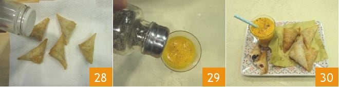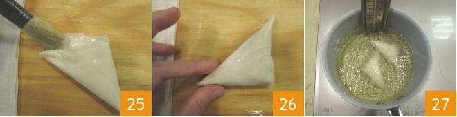 et continuez ainsi jusqu’à terminer la bande de pâte. Badigeonnez le dernier bord avec un peu d’eau 25 avant de le refermer, pour sceller votre sachet 26. Réalisez de cette manière les 7 autres sachets, puis répétez avec les 2 autres feuilles de pâte phyllo pour réaliser les 8 derniers sachets. Au total, vous en obtiendrez 16. Faites chauffer l’huile de friture dans une poêle profonde, et quand elle atteint une température de 170-180°, plongez-y deux sachets à la fois, et faites-les frire 27 environ une demi-minute de chaque côté jusqu’à ce qu’ils soient dorés.