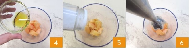 Mettez les morceaux de melon dans le verre du mixeur et ajoutez l’huile 4 et une pincée de sel 5. Mixez soigneusement à l’aide du mixeur plongeant 6