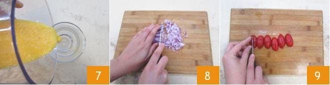 Puis transférez la purée obtenue dans une carafe 7. Placez la carafe au réfrigérateur pour garder votre smoothie de melon au frais. Pendant ce temps, occupez-vous des sachets, en commençant par les ingrédients de la garniture. Hachez finement l’oignon rouge 8 et réservez-le. Coupez les tomates cerises en deux dans le sens de la longueur et découpez-les en lanières 9.