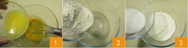 Pour réaliser la ciambella romagnole, commencez par faire fondre le beurre au bain-marie et laissez-le refroidir; une fois froid, ajoutez-le aux œufs et fouettez légèrement pour mélanger 1. Dans un autre bol, versez la farine tamisée 2, le sucre 3,