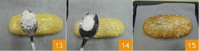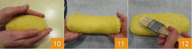 Une fois que vous avez obtenu une pâte homogène et compacte, donnez-lui la forme d'un pain 10, placez-le sur une plaque de cuisson 11 et aplatissez-le légèrement avec les paumes pour l'aplatir, puis badigeonnez la surface avec le lait 12.