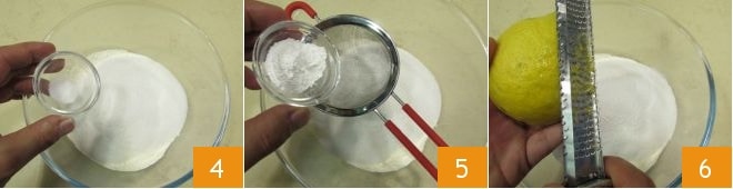 le sel 4 et la levure tamisée 5. Parfumez avec le zeste de citron en prenant soin de râper seulement la partie jaune et non la partie blanche qui serait amère 6.