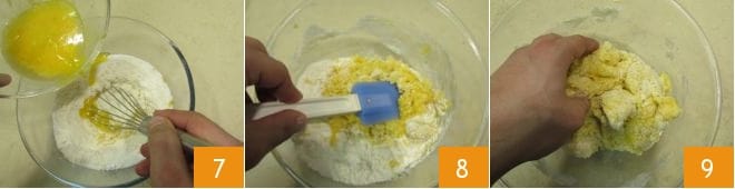 À ce stade, versez le mélange d'œufs et de beurre fondu dans le bol avec les poudres 7 et mélangez avec une spatule pour rassembler les ingrédients 8. Ensuite, transférez la pâte sur le plan de travail et continuez à pétrir à la main 9.