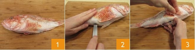 Pour nettoyer la rascasse 1, commencez par l'ouvrir en incisant le ventre avec un couteau : partez de la tête jusqu'à la queue 2, en prenant soin de ne pas abîmer la chair, puis retirez les entrailles 3.