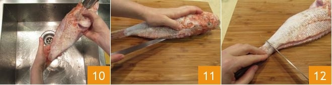 Rincez ensuite soigneusement sous l'eau courante pour enlever tout résidu d'écailles 10, faites une incision avec un couteau aiguisé le long du dos 11 et faites une entaille près de la nageoire caudale 12, pour faciliter le filetage de la rascasse.