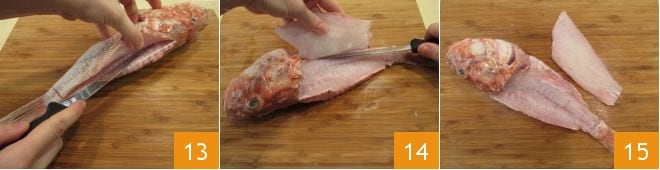 Commencez à fileter en ouvrant la rascasse avec les mains, tout en faisant glisser la lame 13, pour détacher le premier filet 14 et mettez-le de côté 15 pour d'éventuelles préparations. Procédez de la même manière pour l'autre côté. De cette façon, vous aurez obtenu les filets de rascasse utiles pour vos préparations. Si nécessaire, vous pouvez retirer la peau en la coupant avec un couteau à lame aiguisée, en faisant glisser entre la peau et la chair sur toute la longueur du filet.