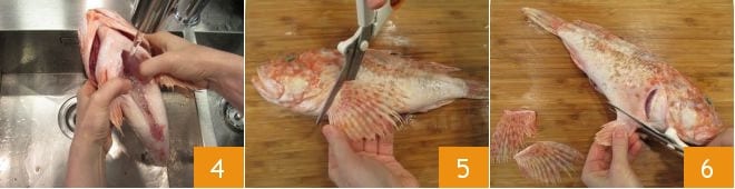 Une fois les entrailles retirées, rincez bien la rascasse sous un filet d'eau fraîche 4, afin d'éliminer tout résidu. Coupez ensuite toutes les nageoires : avec des ciseaux, coupez celle pectorale 5, celle ventrale 6,