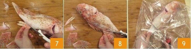 celle sur le bas-ventre 7 et celle dorsale 8. Écaillez-la ensuite avec un couteau en partant de la queue jusqu'à la tête, en l'insérant dans un sac en plastique 9 pour éviter d'éparpiller les écailles.