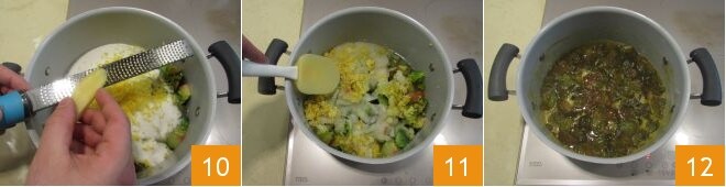 Maintenant, râpez également le gingembre 10. Aidez-vous d'une spatule pour bien mélanger les ingrédients 11. Faites cuire à feu vif jusqu'à ce que la température atteigne 108 °C. Veillez à bien remuer pendant la cuisson pour éviter que la confiture ne colle à la casserole. Les tomates prendront une couleur brune due à la caramélisation des tomates vertes 12.