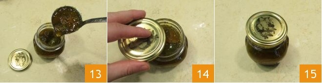 Enfin, à l'aide d'une louche, versez la confiture de tomates vertes dans les pots stérilisés encore chauds 13 en laissant 1 cm d'espace par rapport au bord de chaque pot. Fermez-les bien, mais sans trop serrer 14 et laissez-les refroidir 15. Avec la chaleur de la confiture, le vide se créera naturellement, permettant de conserver le produit longtemps. Une fois les pots refroidis, vérifiez si le vide a été correctement formé : vous pouvez appuyer au centre du couvercle et, si vous n'entendez pas le classique "clic-clac", le vide est bien fait. Votre confiture de tomates vertes est prête à être dégustée !