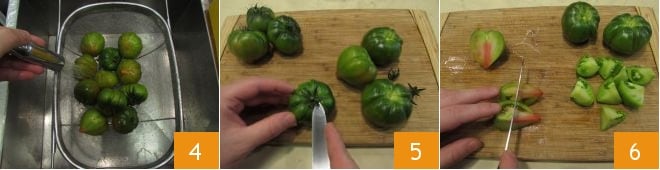 Lavez bien les tomates vertes sous une abondante quantité d'eau 4 et séchez-les avec un chiffon. Ensuite, retirez les pédoncules 5 et coupez-les d'abord en quartiers, puis coupez chaque quartier en deux 6.