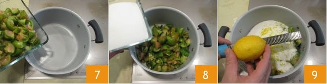 Prenez ensuite une grande casserole. Versez-y les tomates vertes 7 et le sucre 8. Râpez dans la casserole également le zeste de deux citrons non traités 9.