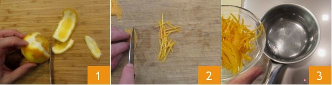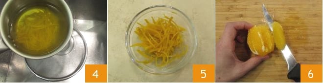 Ensuite, égouttez-les 4 et répétez l'opération, en faisant bouillir à nouveau de l'eau et en blanchissant à nouveau les zestes : en répétant le processus avec de l'eau propre, vous privez le zeste d'une partie de son goût amer. Égouttez à nouveau les zestes et mettez-les de côté 5. Extrayez les quartiers de pulpe des oranges 6, en essayant de préserver également le jus qui en sort (vous pouvez le recueillir dans un bol).