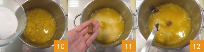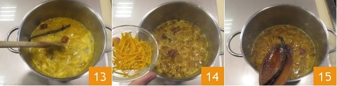 Mélangez les ingrédients 13 ; allumez le feu à moyen-doux et portez à légère ébullition : cuisez ainsi pendant 35 minutes. Après 35 minutes, vous pouvez également ajouter les zestes d'orange 14. Mélangez, puis retirez la gousse de vanille 15 et les bâtons de cannelle.