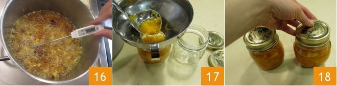Cuisez encore environ 35 minutes : vous devrez vérifier la température avec un thermomètre de cuisine : lorsqu'elle sera à 108° 16, la confiture d'agrumes sera prête. Vous pouvez la verser, encore chaude, dans les pots stérilisés, en vous aidant d'un entonnoir 17. Procédez en fermant bien les pots 18 et en laissant la confiture refroidir complètement. Assurez-vous, avant consommation, que les couvercles ne fassent pas le classique "clic-clac" en appuyant au centre, signe que le vide n'a pas été correctement réalisé. Pour ces indications et d'autres, nous vous renvoyons toujours aux informations concernant les conserves maison du Ministère de la Santé.