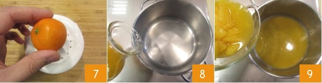 Pressez ensuite le jus de toutes les mandarines 7, filtrez-le et versez-le dans une casserole 8 ; ajoutez la pulpe des oranges et leur jus 9,