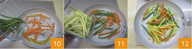 puis ajoutez les haricots verts 10, poursuivez la cuisson pendant encore 3-4 minutes enfin ajoutez aussi les courgettes 11, continuez à cuire les légumes pendant quelques minutes, ils doivent rester croquants 12.