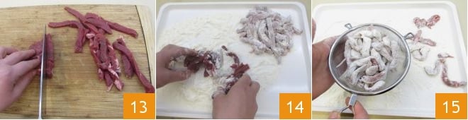 Coupez le bœuf en lanières 13, farinez-les soigneusement 14 puis éliminez l'excès de farine avec un tamis 15. Dans une autre poêle, chauffez 30 g d'huile d'olive,