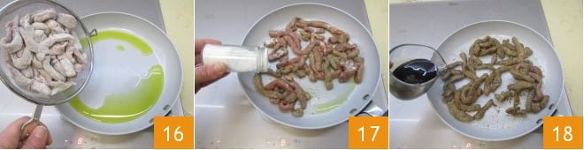 puis versez les lanières de viande 16 faites-les dorer de tous les côtés pendant 2-3 minutes, salez 17, poivrez et déglacez avec le vinaigre balsamique 18,