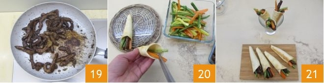 laissez évaporer puis éteignez le feu 19. Tout est prêt pour garnir les cornets : prenez un cornet de pâte et remplissez la cavité avec des légumes et des lanières, en vous aidant d'une pince de cuisine 20. Vos délicieux cornets avec lanières de bœuf et légumes croquants sont prêts à être servis 21.