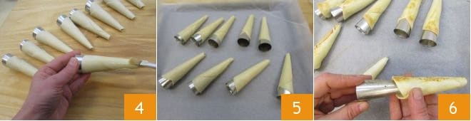 et ensuite badigeonnez toute la surface avec l'œuf battu 4. Placez les cônes sur une plaque recouverte de papier sulfurisé 5 et faites cuire les cônes dans un four statique à 200° pendant 10 minutes (ou statique à 180° pendant 8 minutes) jusqu'à ce que l'extérieur soit doré, à la fin de la cuisson, sortez les cornets du four et lorsqu'ils sont froids, retirez délicatement le cône 6.