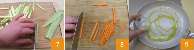 Lavez les légumes, équeutez les haricots verts et les courgettes, coupez ces dernières en fines lanières 7, pelez les carottes et réduisez-les également en lanières 8. Dans une poêle, chauffez 20 g d'huile d'olive, faites dorer une gousse d'ail entière 9 puis ajoutez les carottes, faites cuire pendant 3-4 minutes