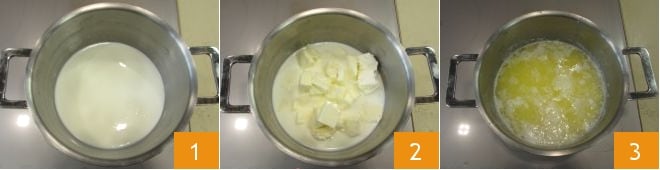 Pour préparer le pain de maïs, vous devrez préparer séparément les ingrédients liquides et secs puis les mélanger ensemble à la fin. Cette méthode est appelée "méthode muffin". Dans une casserole, commencez à chauffer le lait 1 et versez le beurre en morceaux 2. Vous devrez chauffer le mélange jusqu'à ce que le beurre soit fondu 3.