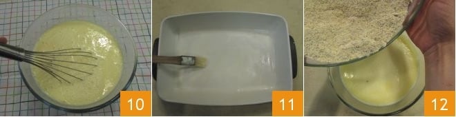 De cette façon, l'œuf atteindra la même température que le mélange de beurre et de lait sans coaguler 10. Préchauffez le four à 170° en mode ventilé et beurrez un moule rectangulaire de 30,5x22,5 11 ; une fois les mélanges liquides mélangés, vous pouvez passer à verser tous les ingrédients secs dans le mélange liquide d'œufs, de beurre et de lait 12,