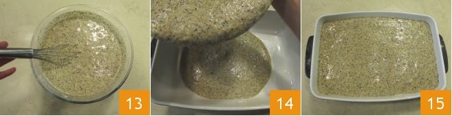 mélangez le strict minimum pour amalgamer 13. Versez rapidement le mélange dans le moule beurré précédemment (14-15) et placez-le immédiatement dans le four préchauffé à 170° en mode ventilé pendant environ 20-25 minutes, en cuisant sur la grille la plus basse. Ajustez pour plus de précision avec la puissance de votre four, en augmentant ou en diminuant la température de 10° par exemple ; ou laissez les 170° en mode ventilé mais augmentez le temps de cuisson.