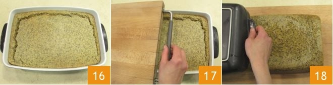 Une fois cuit, sortez le pain de maïs du four 16, laissez-le tiédir puis placez une planche à découper dessus pour retourner le moule 17 ; retirez délicatement le moule 18,